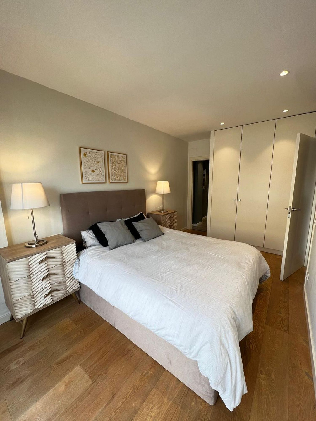 Featuring three bedrooms — a master suite with a double bed and two additional single bedrooms — the apartment comes fully furnished and equipped with modern appliances, ready to move in. The kitchen integrates with the living-dining area, creating an open, modern space with induction hob, oven, dishwasher, microwave, and fridge.