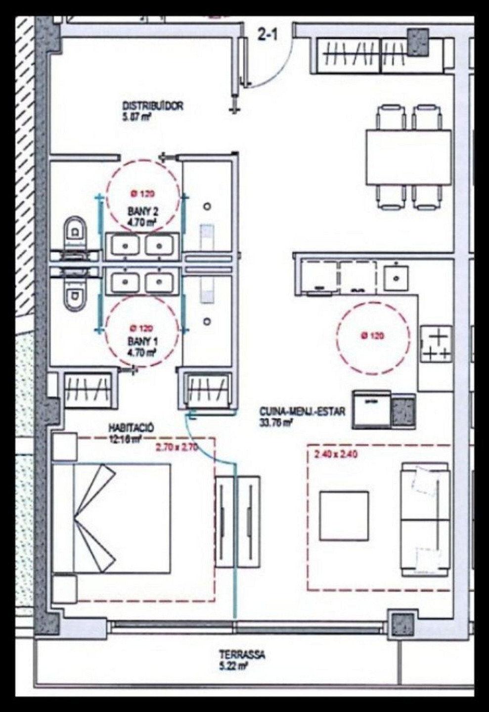 The living area extends onto a pleasant terrace of just over 5 m², offering an outdoor space to enjoy mountain views and the tranquillity of the surroundings. The southeast orientation guarantees abundant natural light throughout the day, enhanced by large windows with aluminium frames and double glazing.