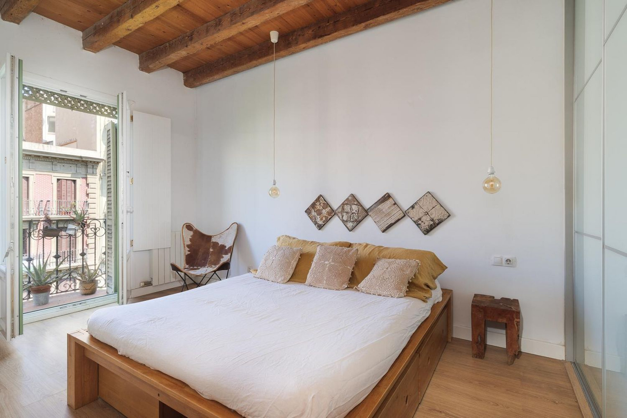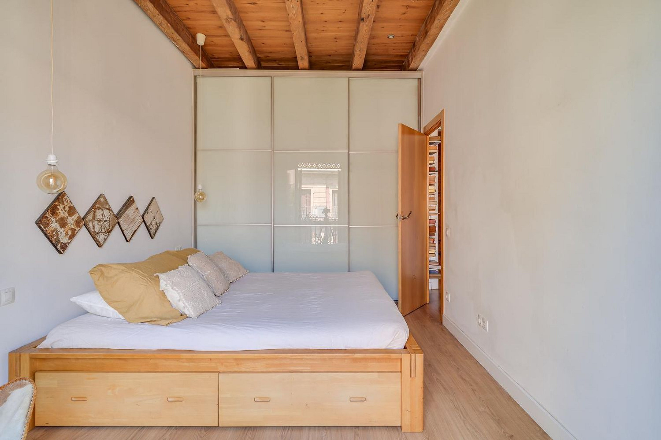 Located in the heart of Eixample, this 61 m² penthouse with a 55 m² terrace offers the perfect balance of light, comfort, and urban style. The spacious living-dining area features balconies, an original stone wall, and traditional Catalan beam ceilings, creating a warm and inviting atmosphere ideal for daily life or entertaining.