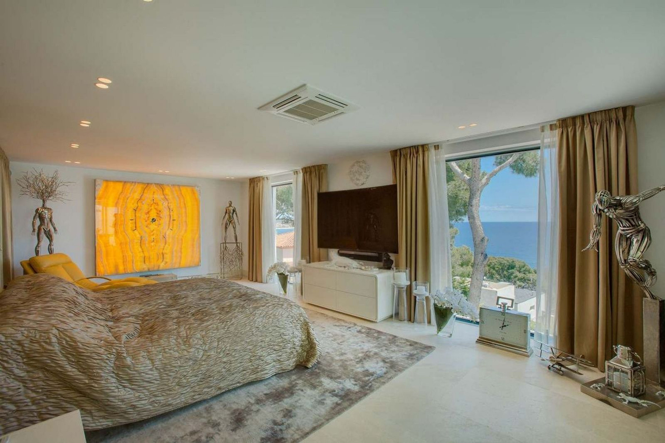 On the semi-basement level, the villa offers a dedicated wellness area including a gym, a spa with Turkish bath and a full bathroom, creating the perfect space to relax and recharge. The property also features decorative sculptures by renowned Spanish sculptor Fernando Suárez, adding a distinctive artistic touch.