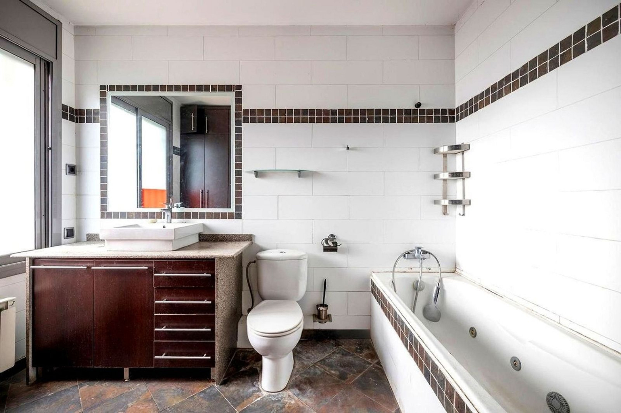 The main floor features an open-plan living space, where a modern kitchen integrates seamlessly with the living and dining area. This bright and spacious environment connects directly to a large terrace at pool level, surrounded by a private garden—ideal for outdoor living throughout the year. A guest toilet completes this level.
