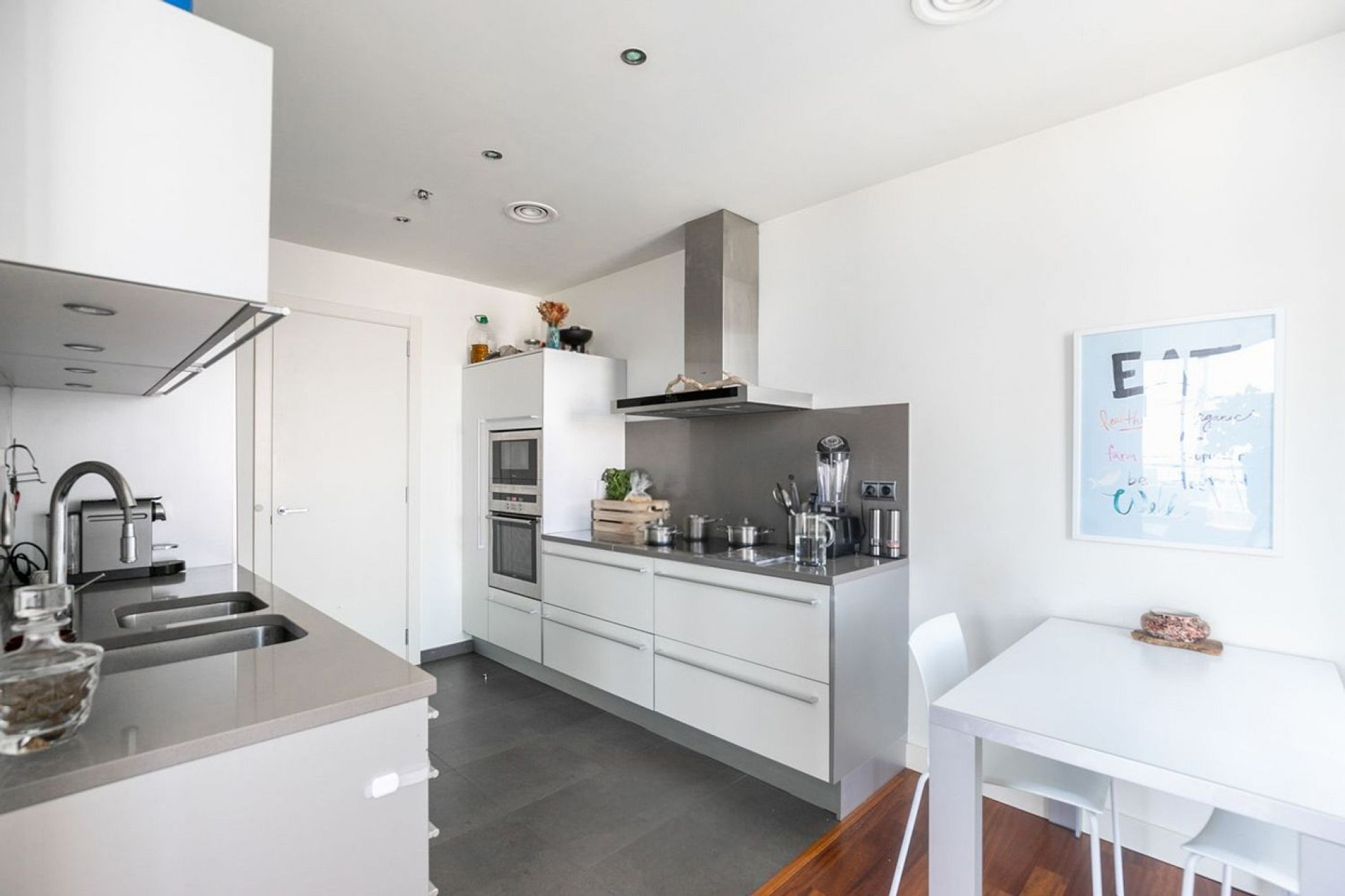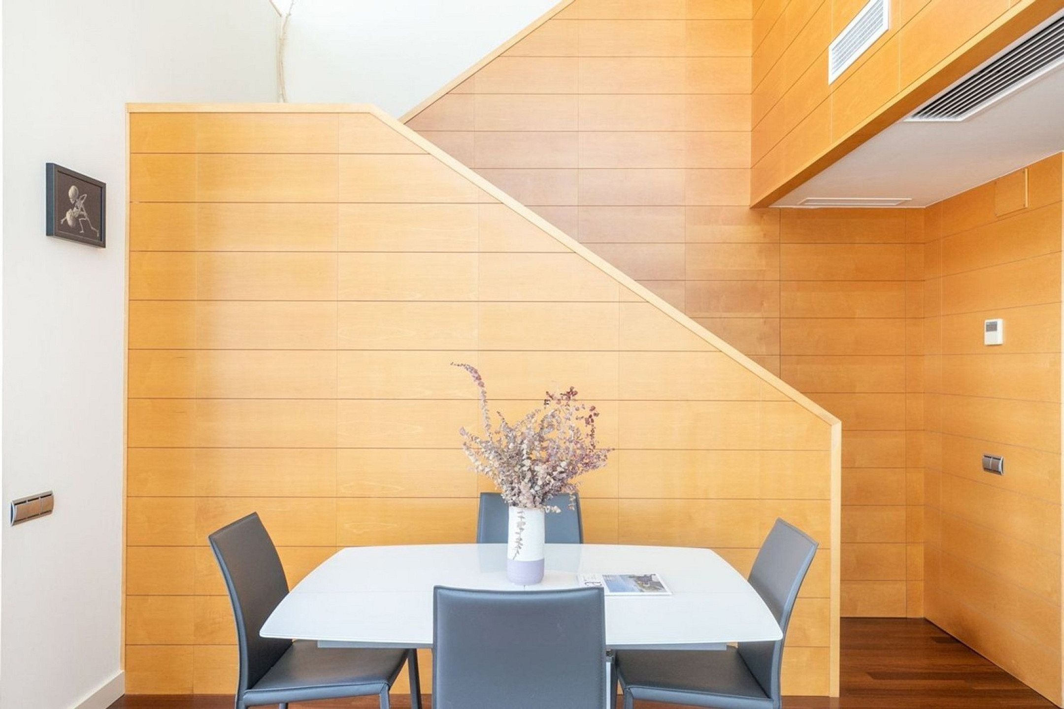 The upper floor houses two naturally bright double bedrooms and a full bathroom with shower. Additional features include a laundry room, ducted air conditioning and heating, double-glazed windows and doors for thermal and acoustic insulation, and a reinforced security door, ensuring comfort and safety throughout.