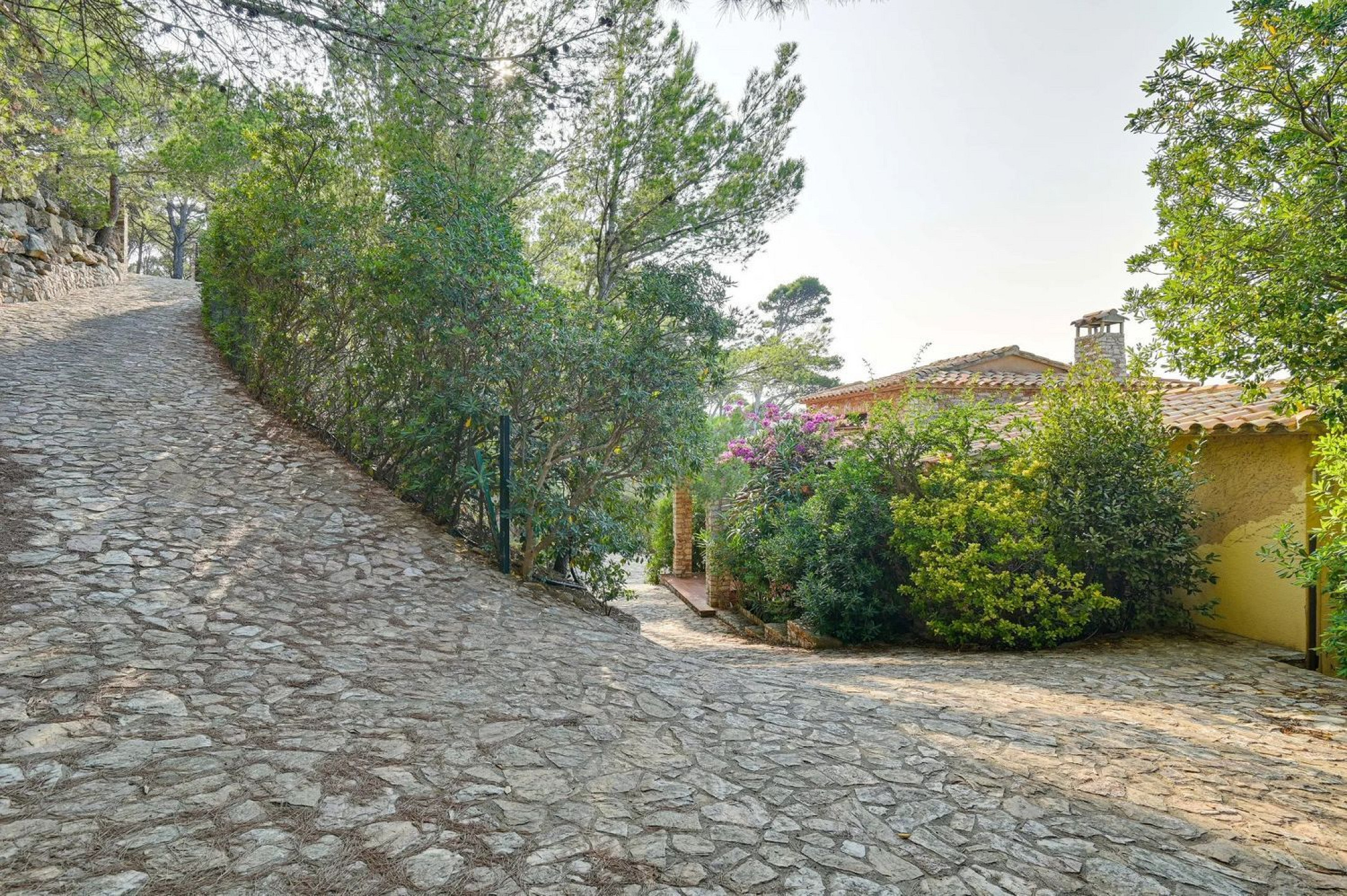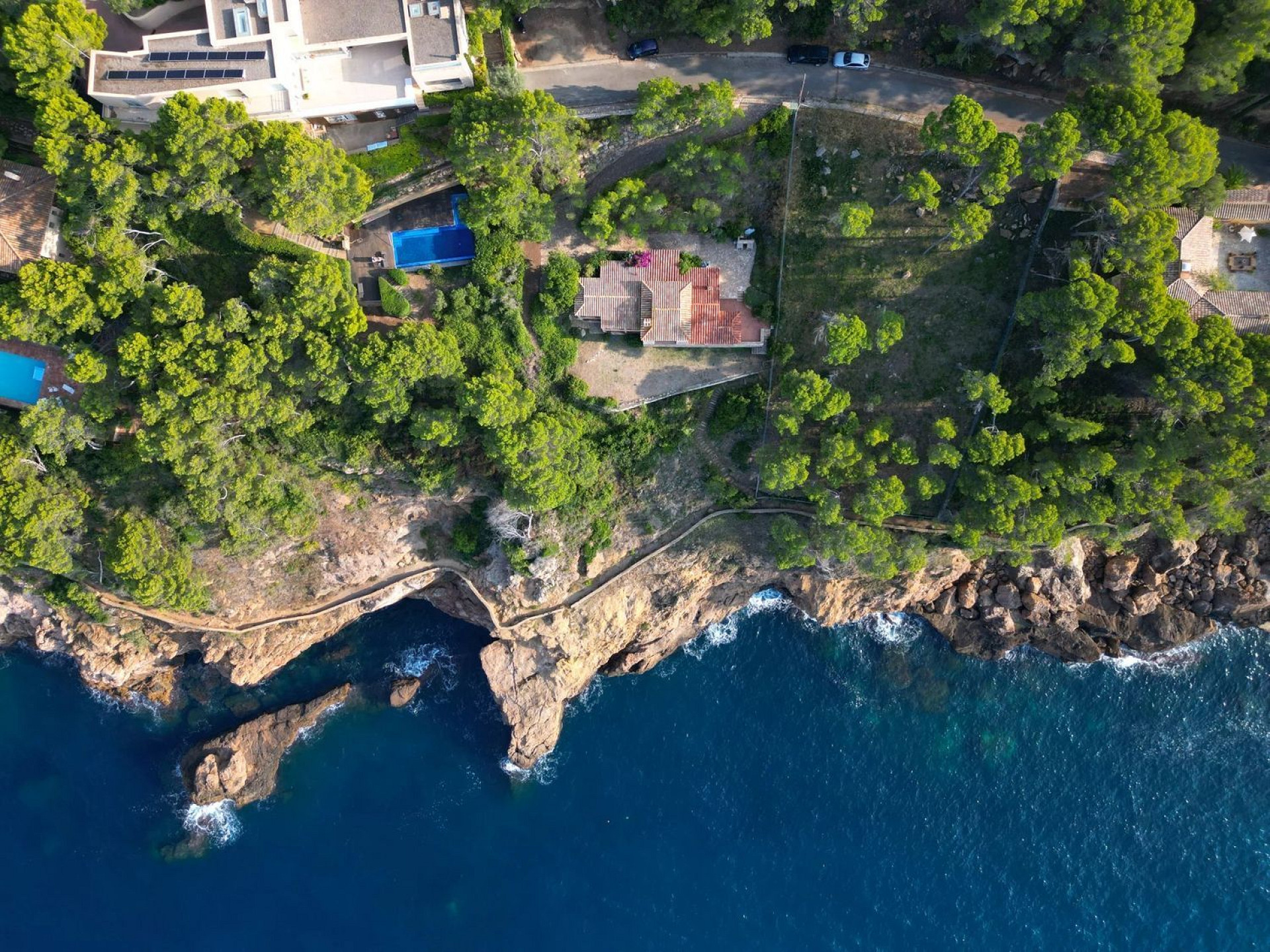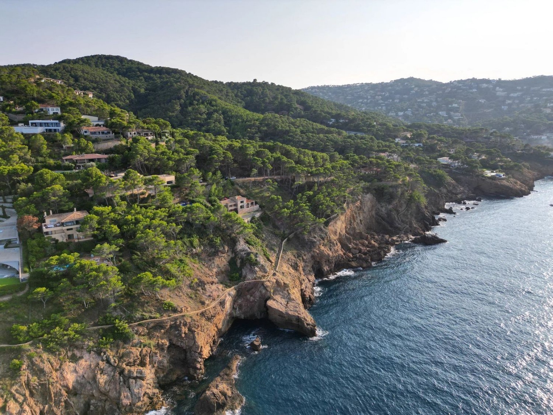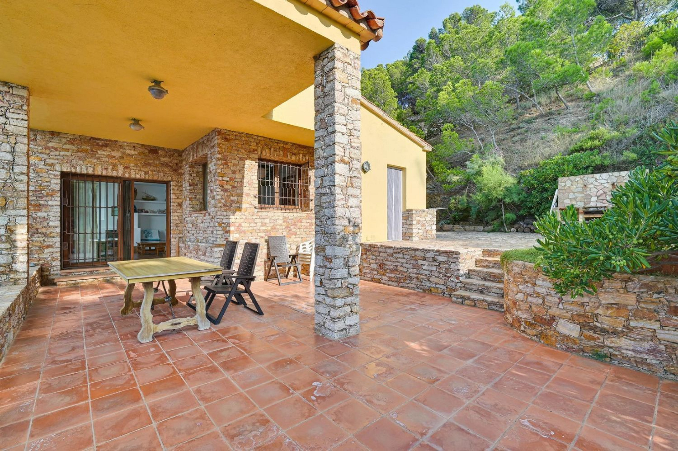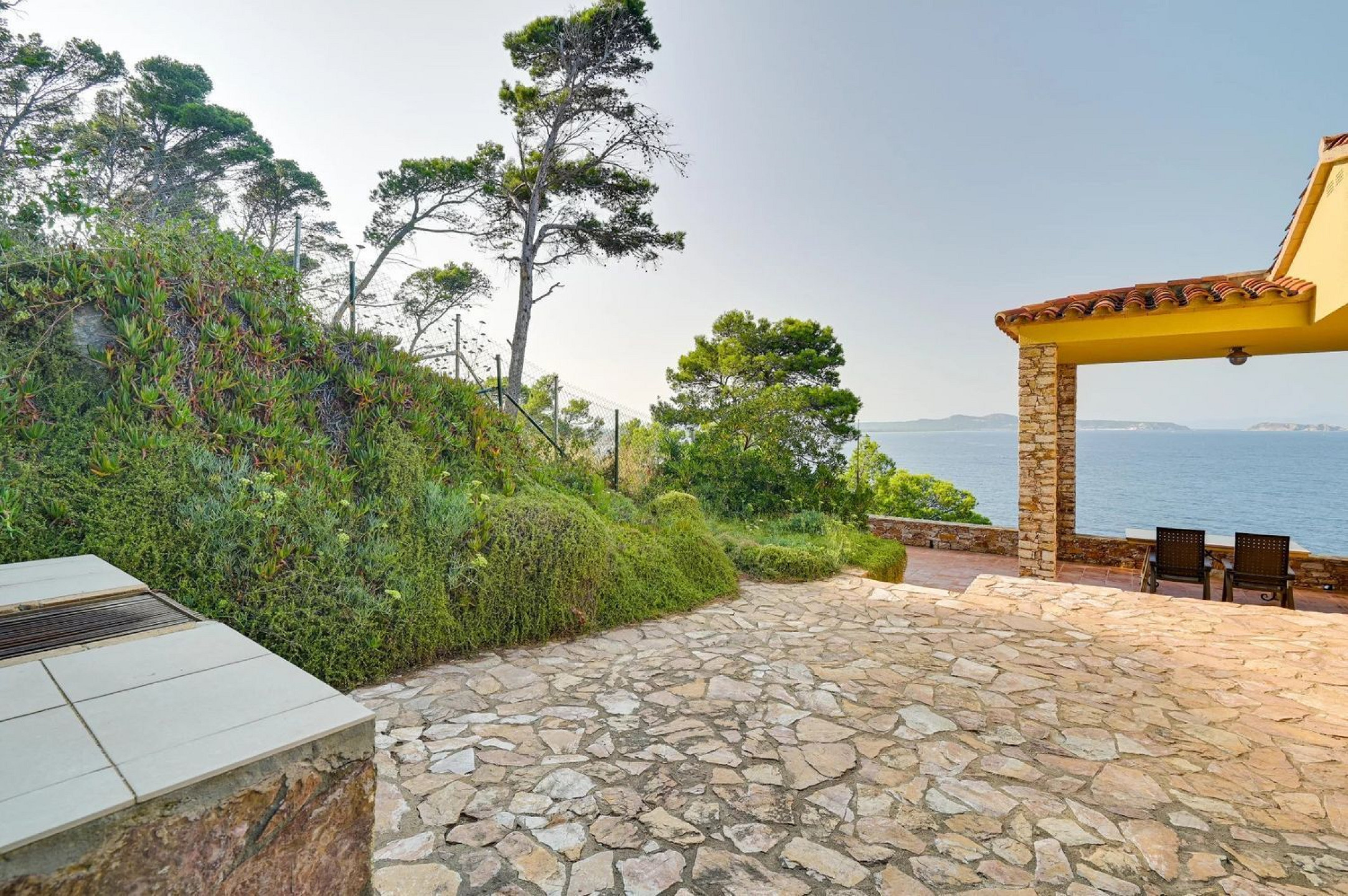 Spectacular Mediterranean-style villa in first-line sea position in Begur, surrounded by lush pine forests and crystal-clear Mediterranean waters. The main residence, built with the iconic Begur stone on a flat plot, offers panoramic views of the Medes Islands from every room.