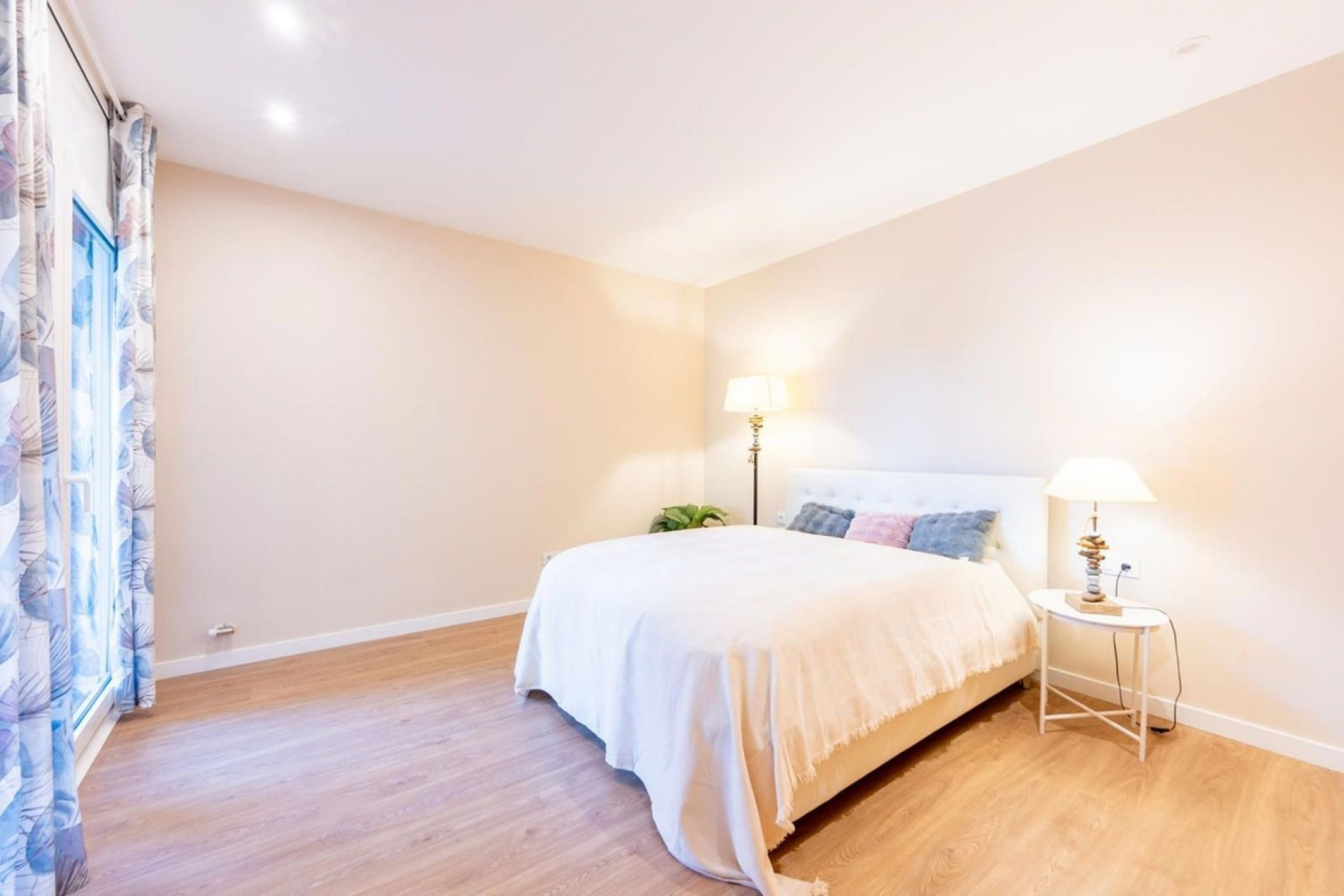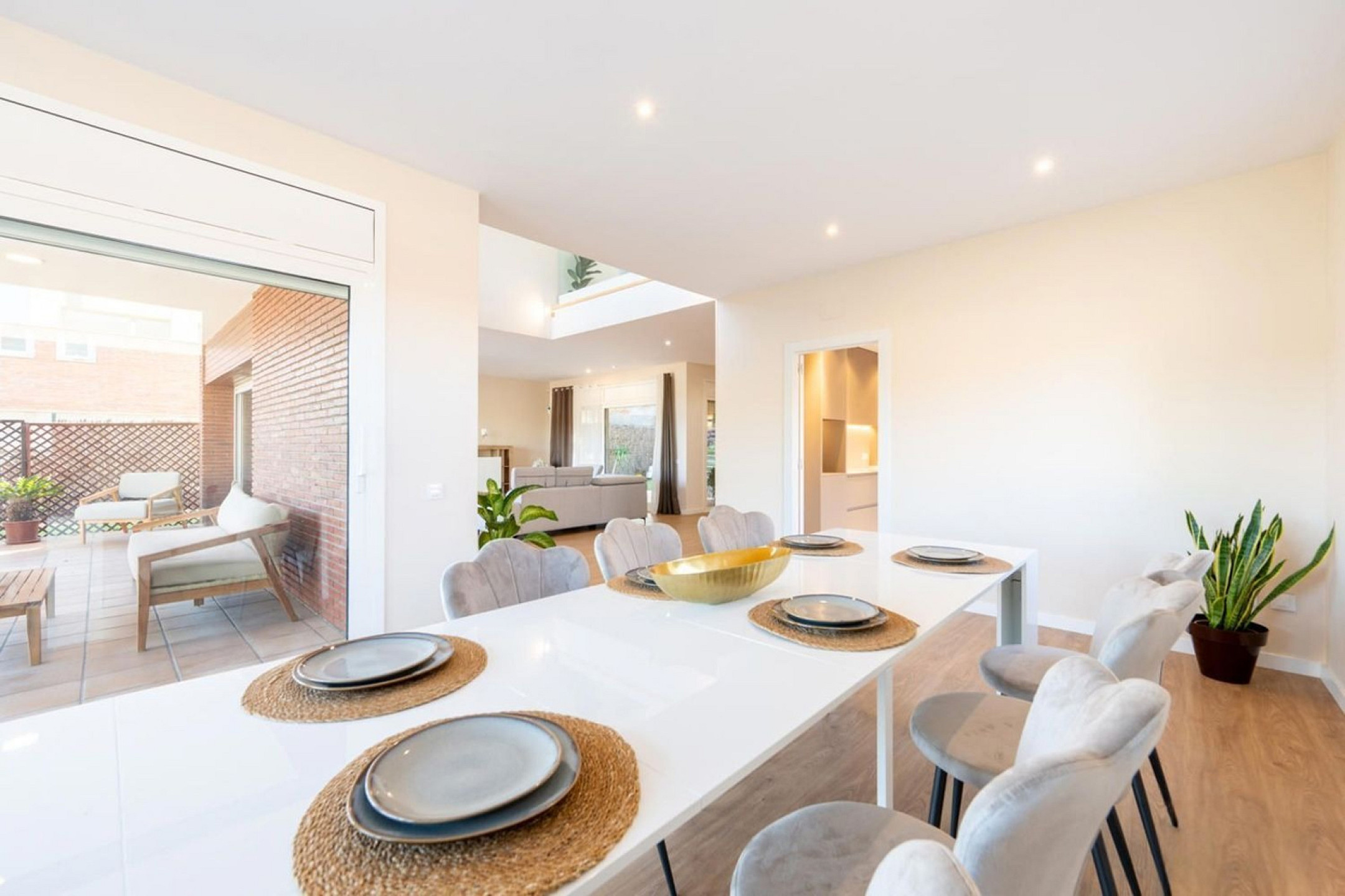 The ground floor houses the main living area, featuring a spacious lounge that opens onto the garden through large-format windows. The outdoor area has been designed as a natural extension of the home, offering a private swimming pool, chill-out area, barbecue space and outdoor dining area. The kitchen, with central island and pantry, is complemented by a separate dining room. This level also includes two en-suite bedrooms.