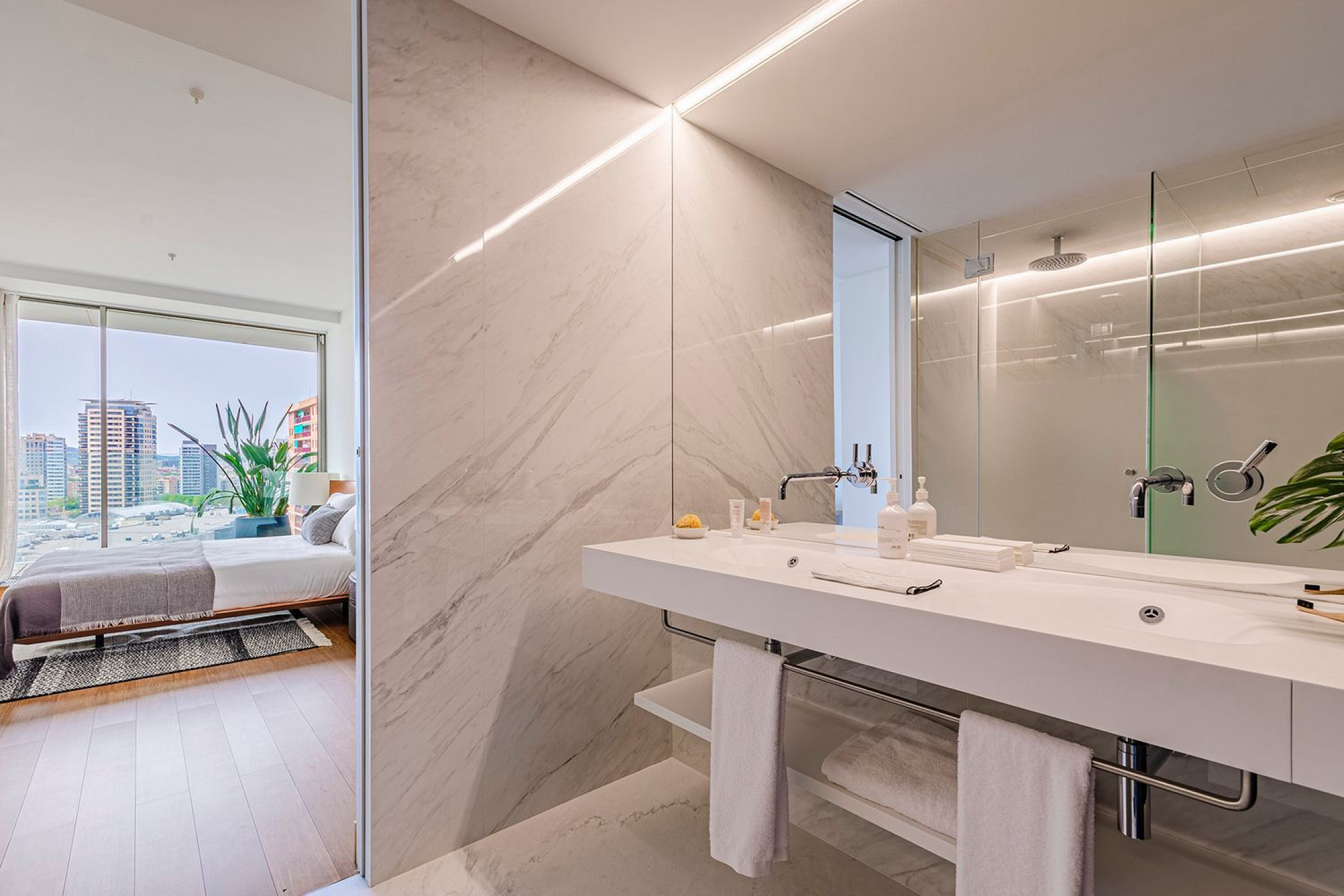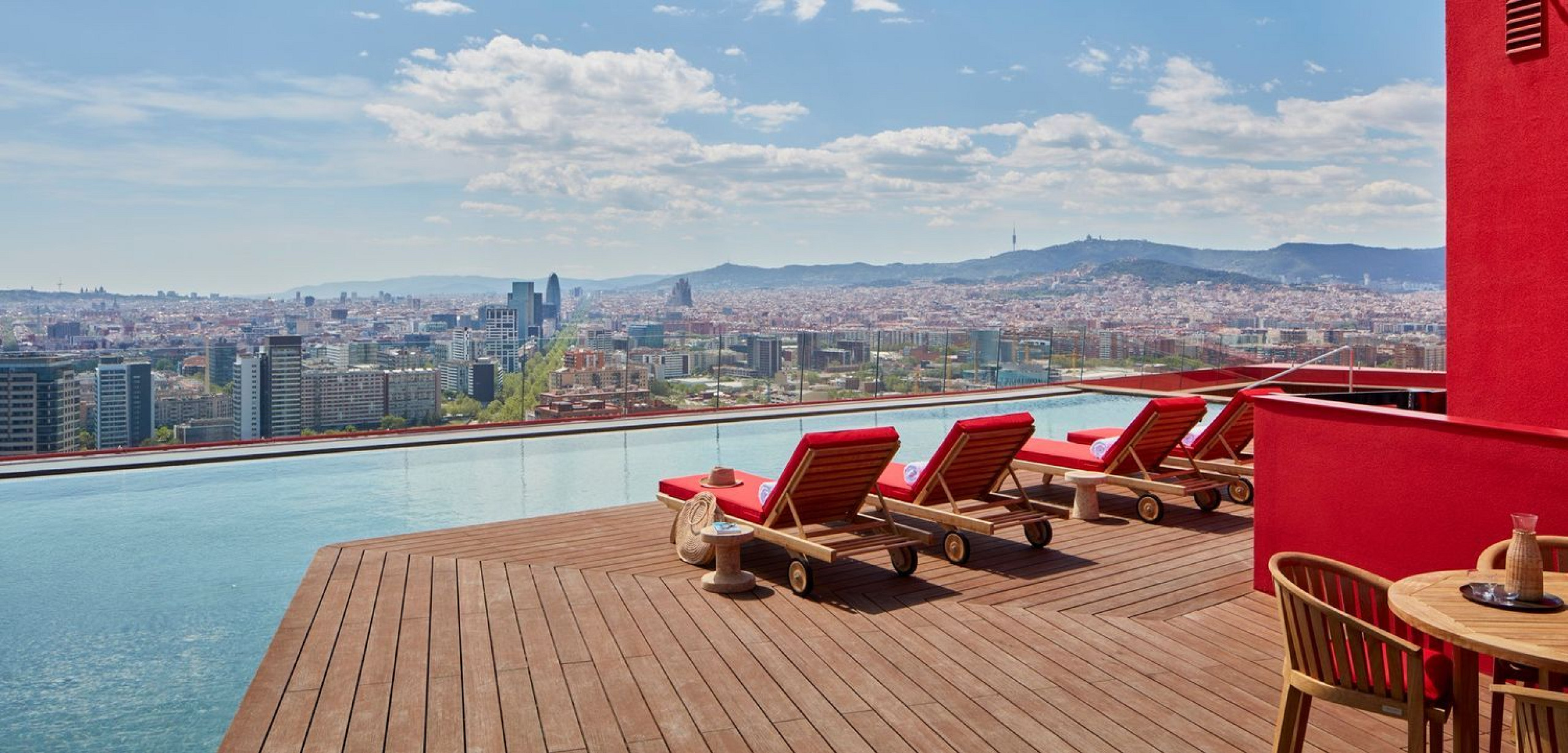 Elegant communal lounges are available for private gatherings and events, while the rooftop features an impressive infinity pool of exceptional length, offering panoramic views over the Mediterranean and the Barcelona skyline.