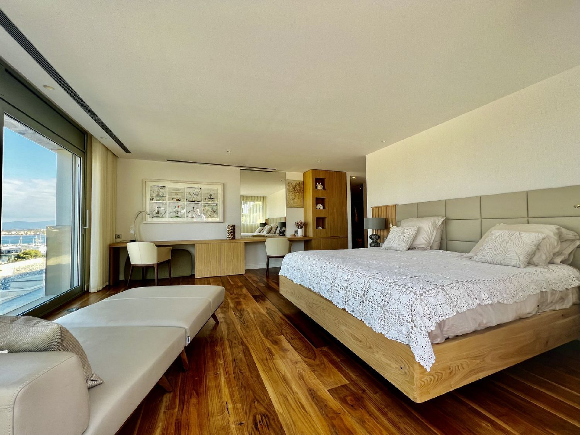 The villa features six spacious bedrooms, an additional guest toilet, a bright living-dining area, a fully equipped kitchen, and an elevator connecting all floors. The master suite stands out for its size and harbor views, while the other bedrooms offer privacy and abundant natural light.