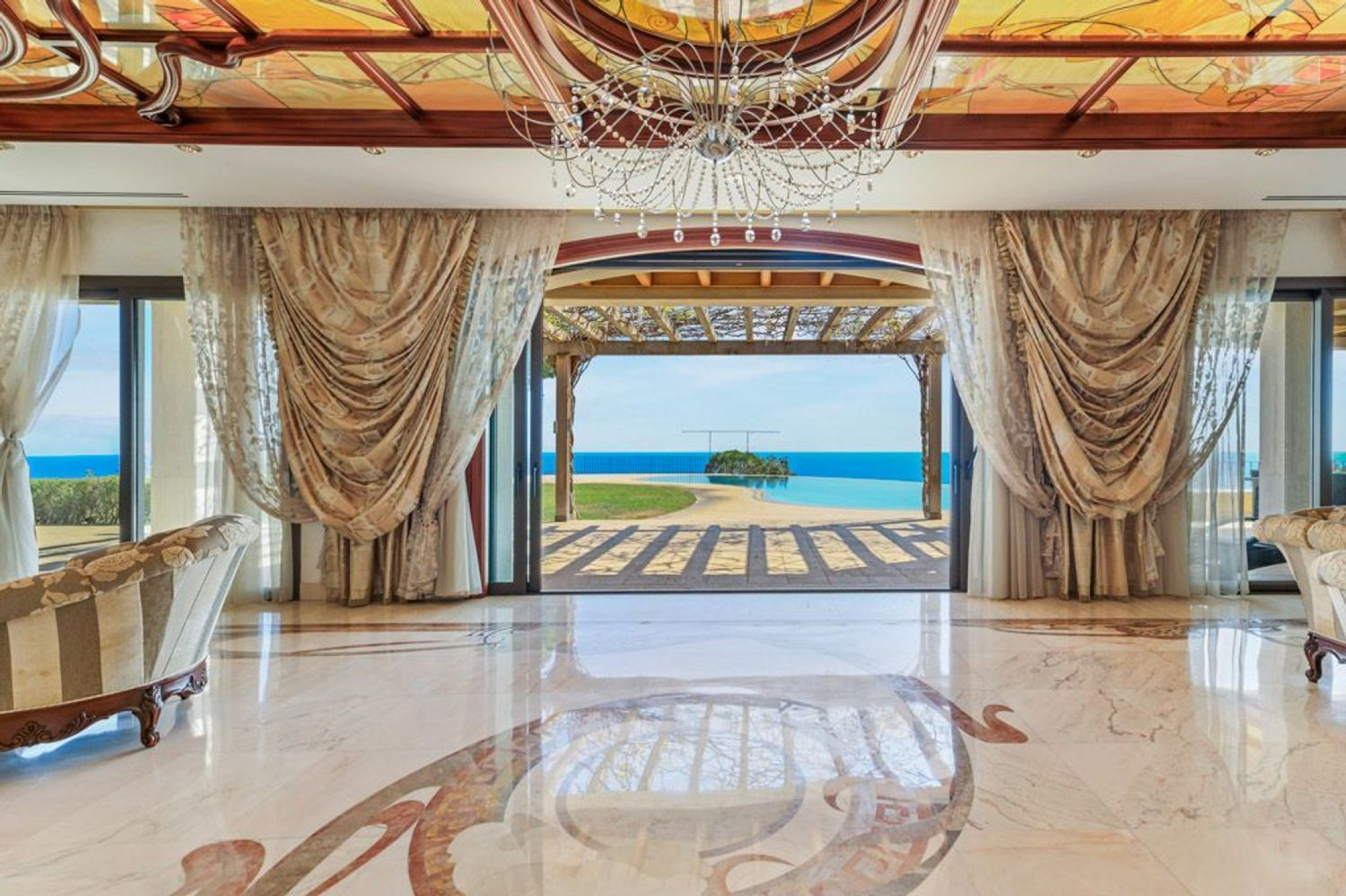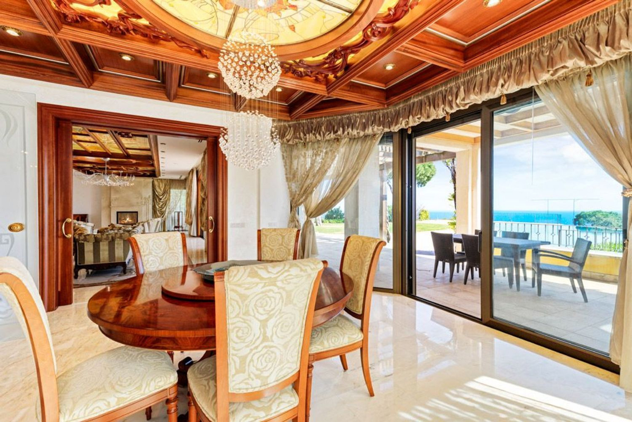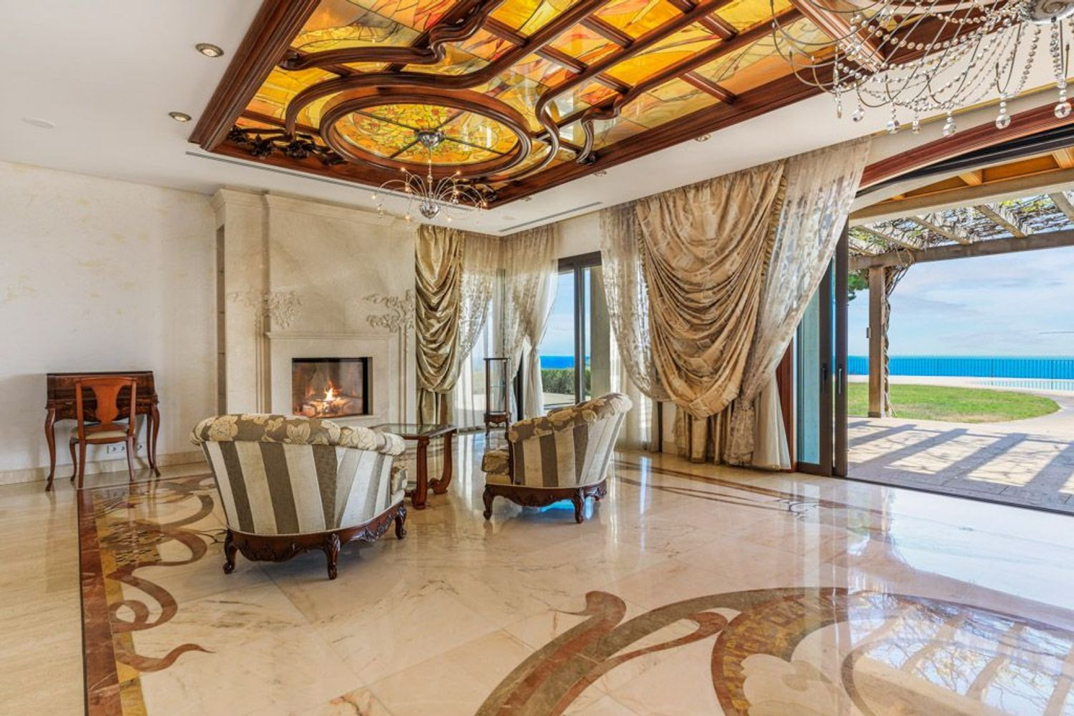 The main floor features a grand entrance hall leading to a fully equipped kitchen with high-end appliances, the dining room, and a spacious living area with fireplace, as well as a relaxation area with library, office, and bathroom. All main spaces open directly to the garden, offering panoramic sea views and a sense of openness and tranquility in every corner.