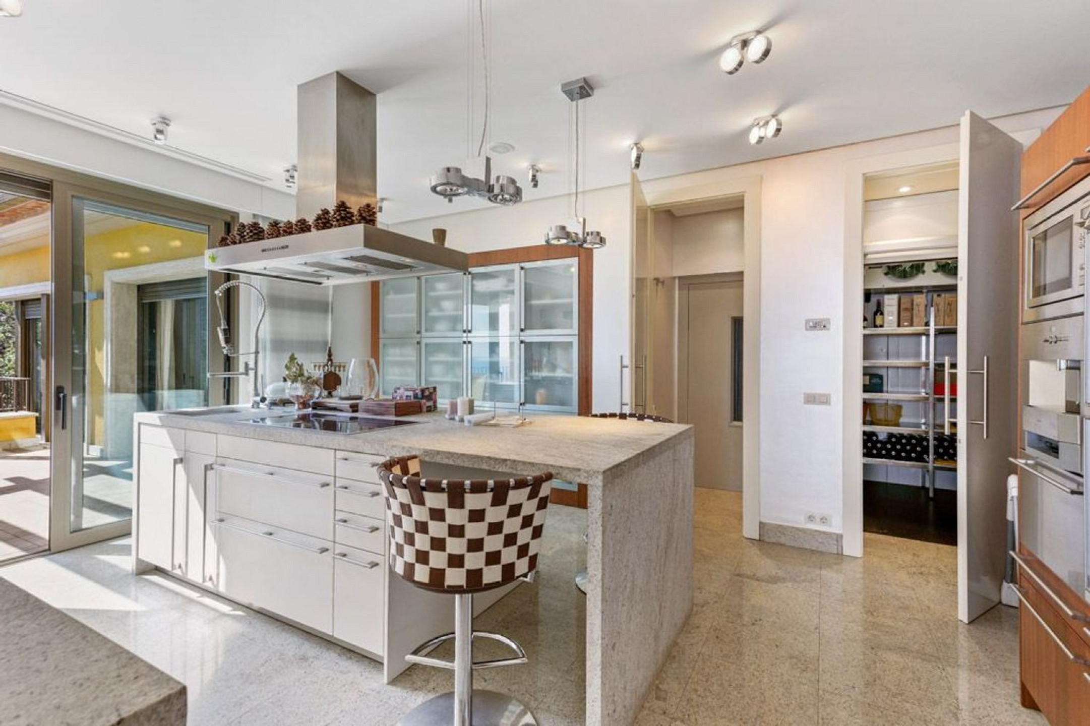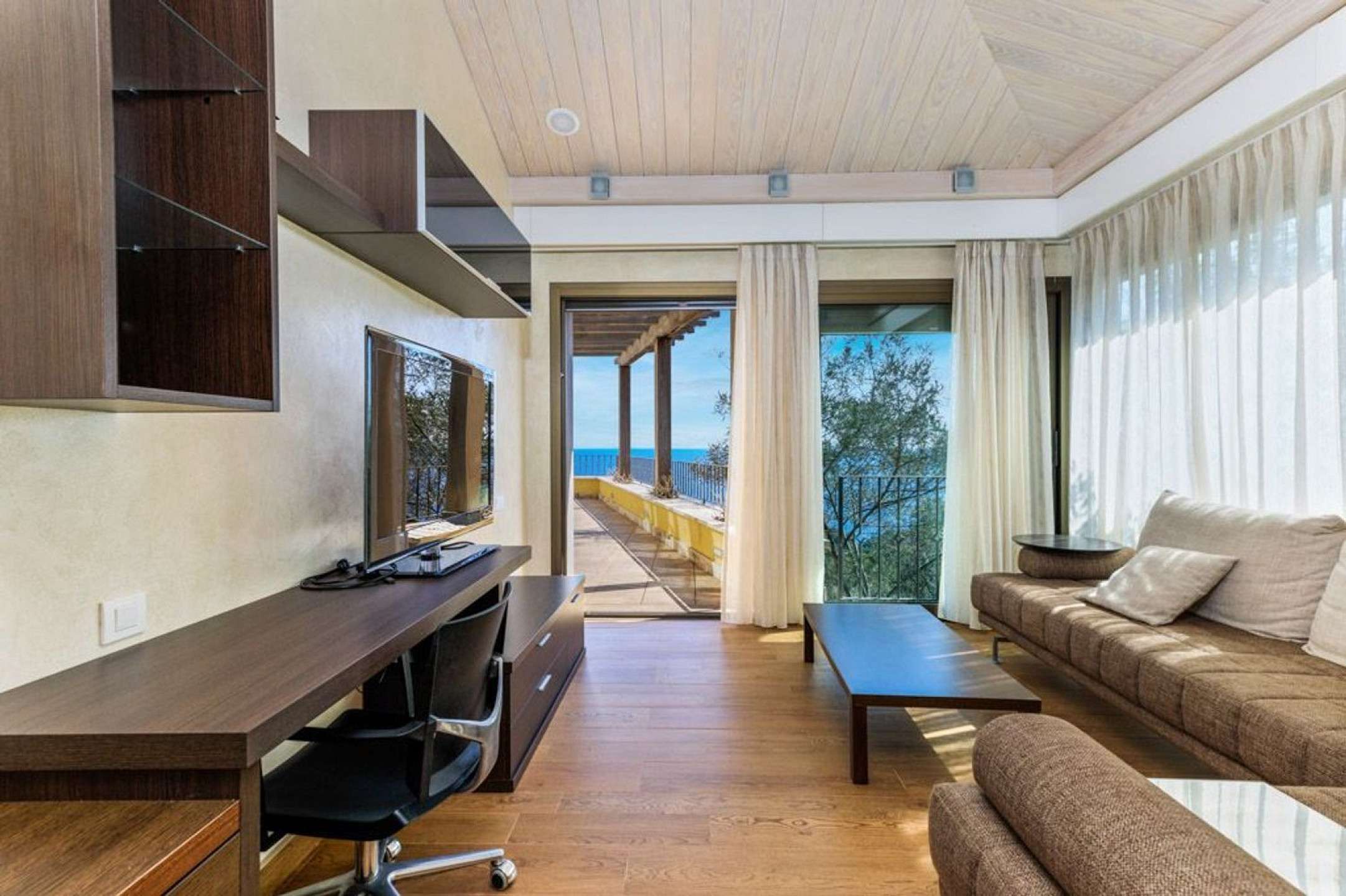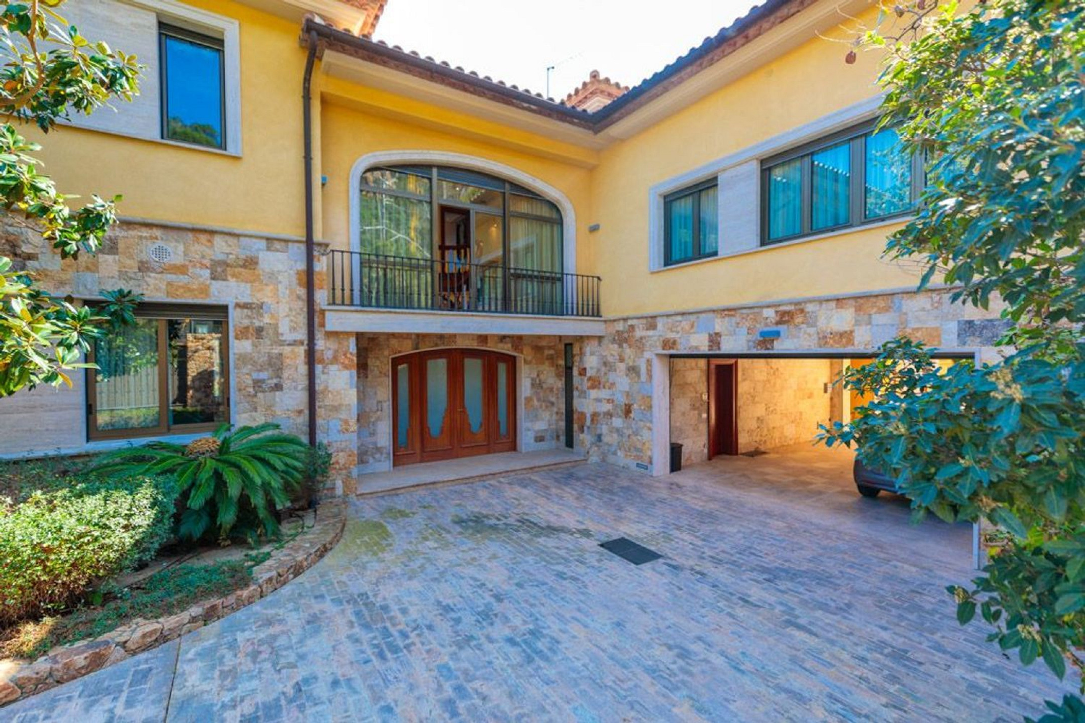 The exterior is a true Mediterranean retreat, with a 137 m² heated pool, flat gardens, terraces with chill-out areas, jacuzzi, and barbecue, all with uninterrupted sea views. The villa also includes a traditional Catalan wine cellar, private garage, heating, air conditioning, alarm system, and marble floors.