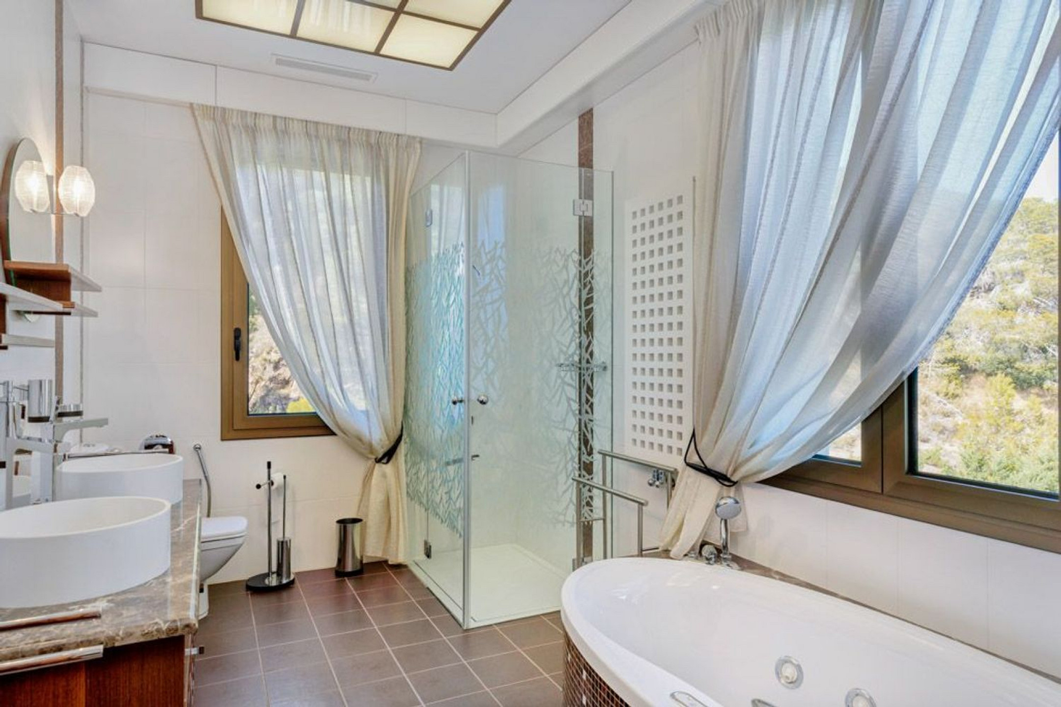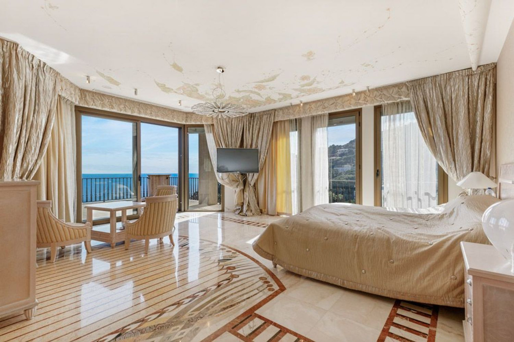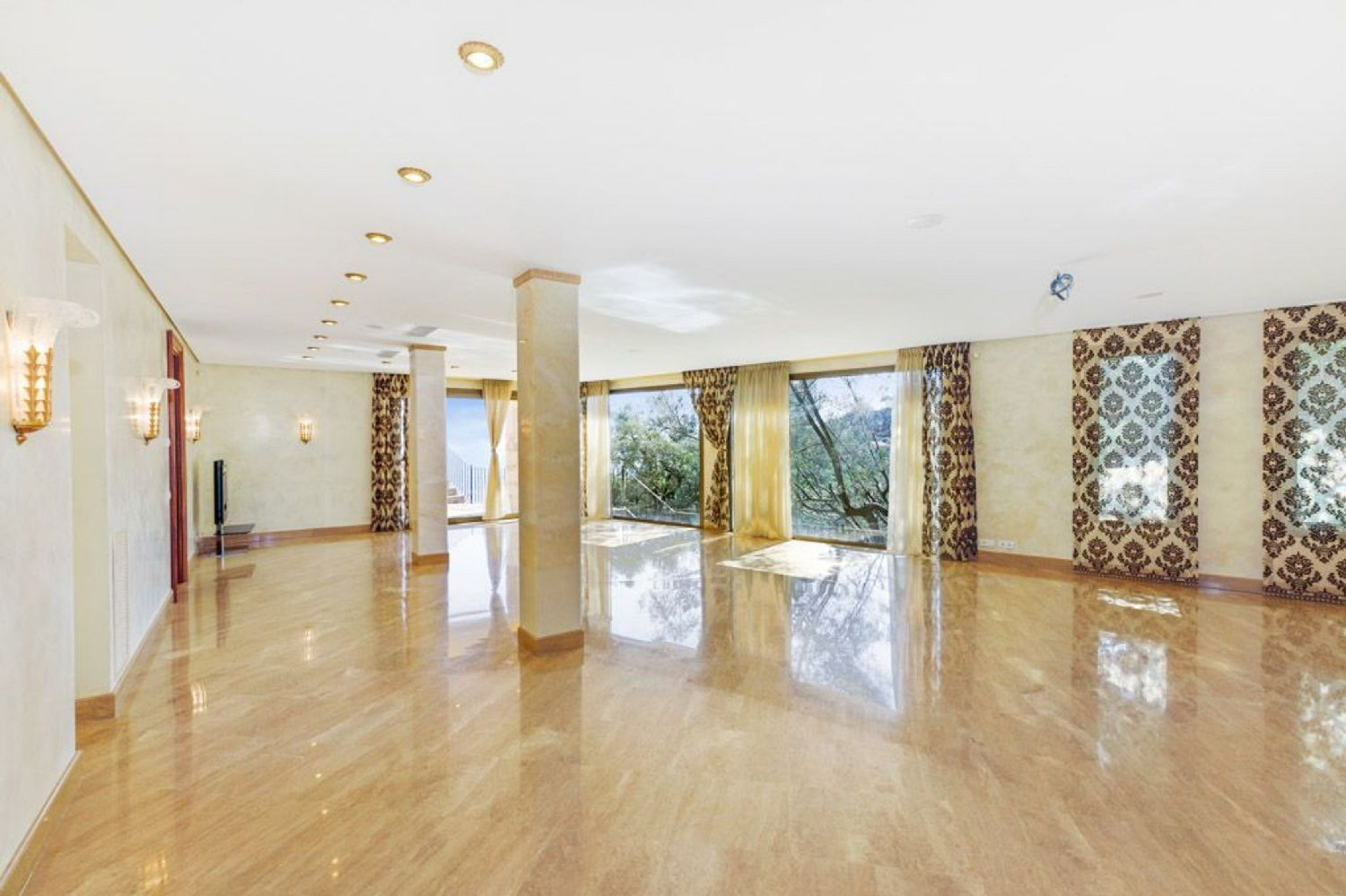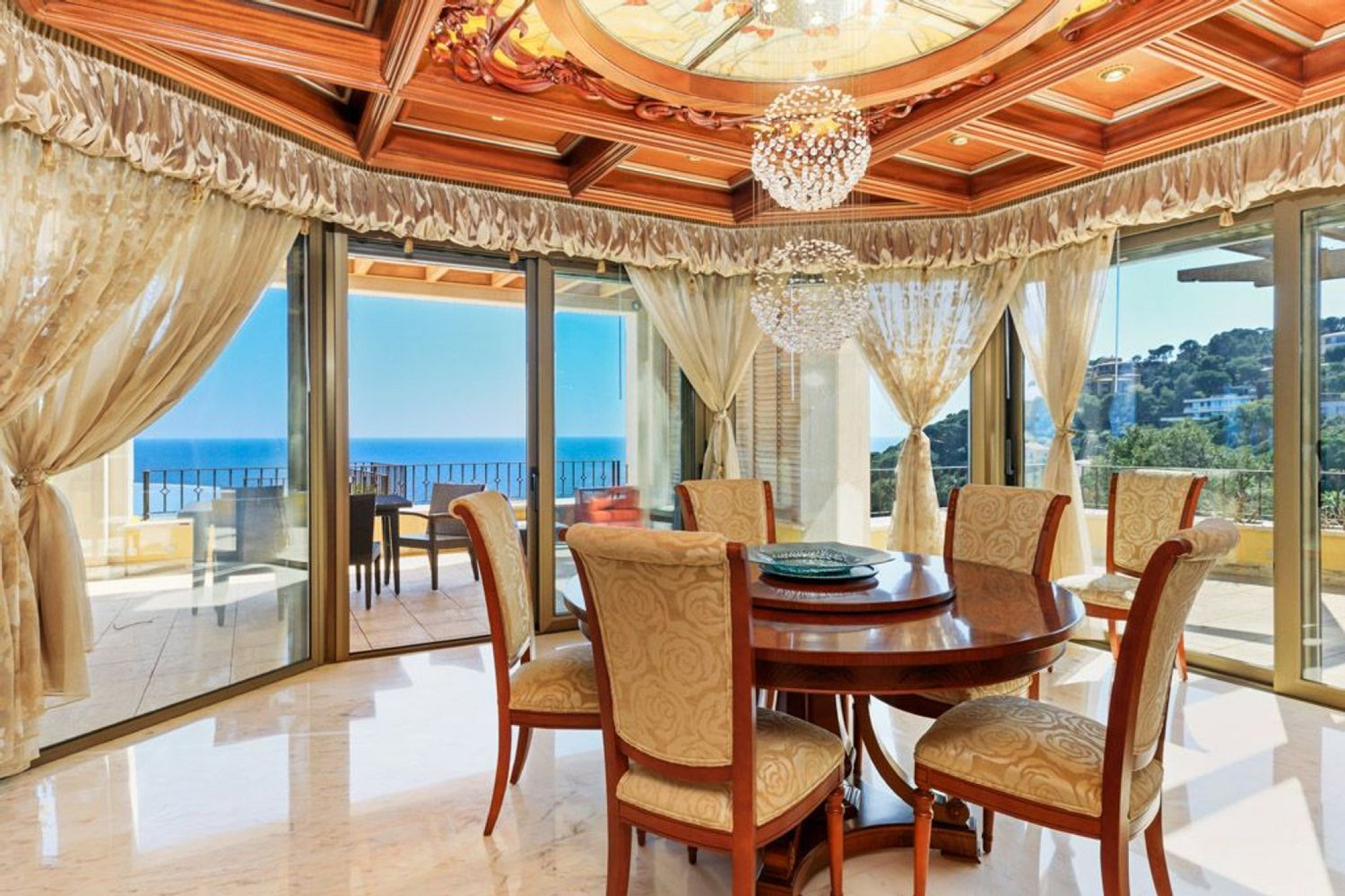 The exterior is a true Mediterranean retreat, with a 137 m² heated pool, flat gardens, terraces with chill-out areas, jacuzzi, and barbecue, all with uninterrupted sea views. The villa also includes a traditional Catalan wine cellar, private garage, heating, air conditioning, alarm system, and marble floors.