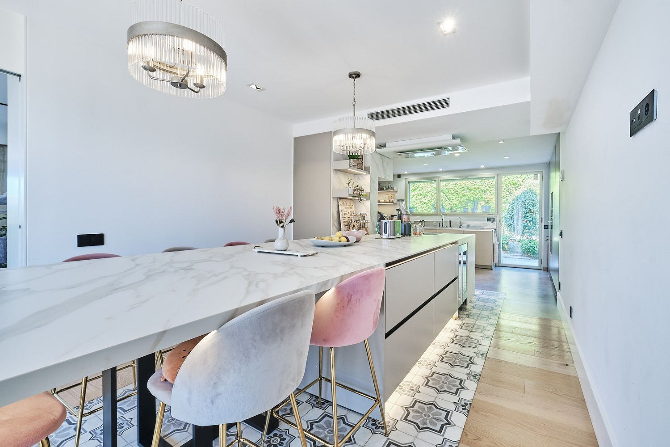 The ground floor hosts the main sleeping area with four generous suites, including the principal suite of 44 sqm with walk-in wardrobe and integrated bathroom, designed for maximum comfort and privacy. Level 1 encompasses the daytime living area: a 50 sqm corner living-dining room with terrace access, a 41 sqm kitchen-office with high-end appliances and access to terrace and garden, plus an independent bedroom with full bathroom, achieving a seamless balance of design and functionality.