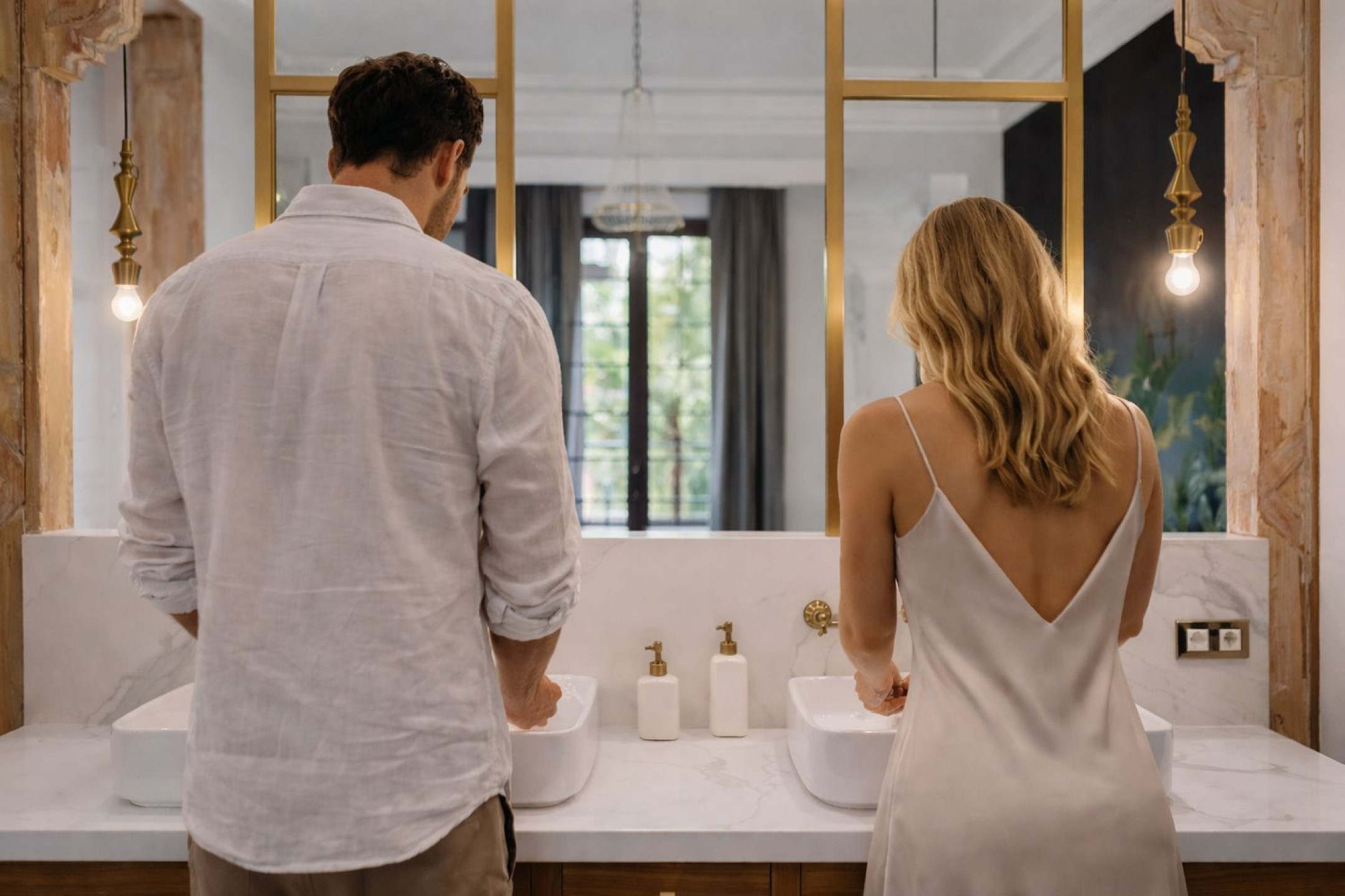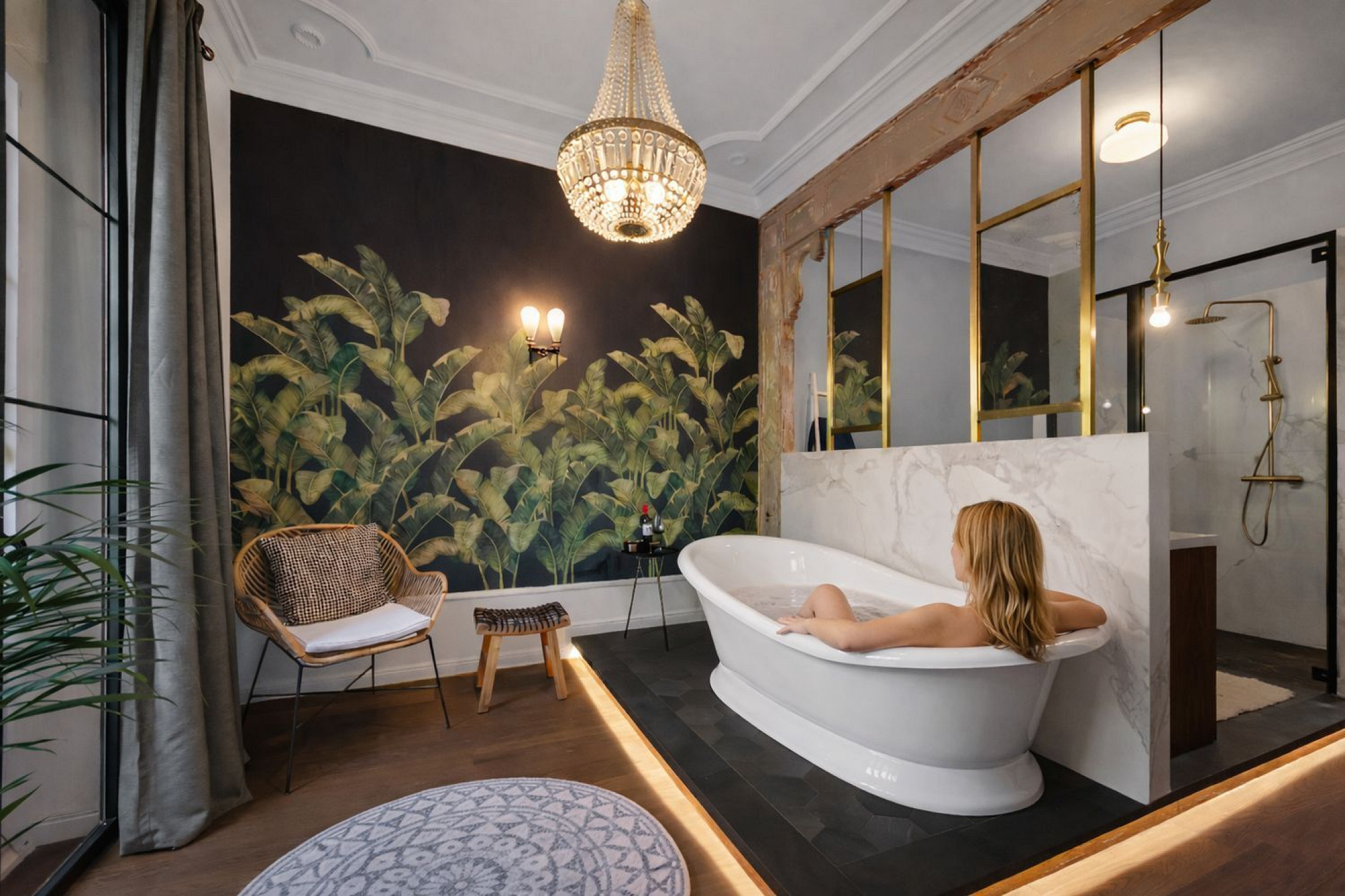 The apartment is organised around an impressive main suite of over 50 m², conceived as an independent wing within the home. It features a bespoke walk-in dressing room with custom carpentry and a spa-style bathroom with a freestanding bathtub and walk-in shower. The 3.5-metre-high ceilings enhance the sense of space and bring a calm, elegant presence to every room.