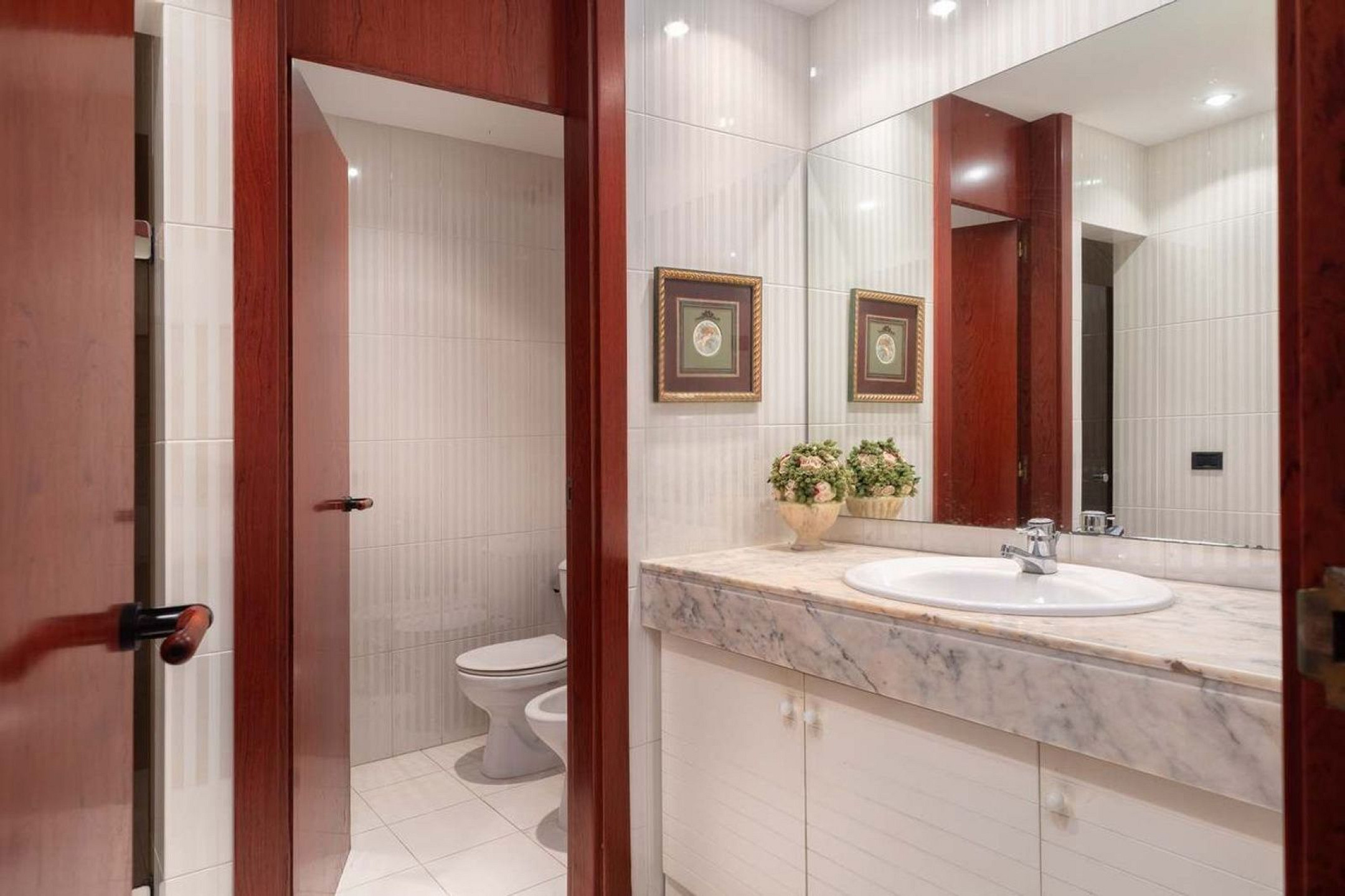 On the lower level are the main living areas: a spacious living room, dining area, open kitchen, laundry room and guest toilet. This floor also features three additional bedrooms sharing a full bathroom. The space opens onto a generous 60 sqm porch and the garden, from where a lower level leads to the swimming pool and its technical room.