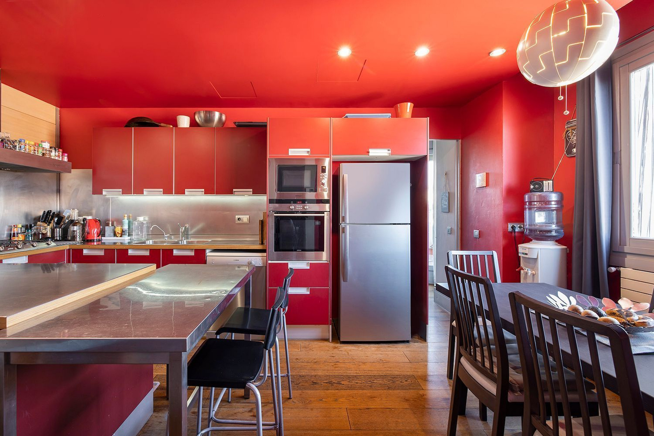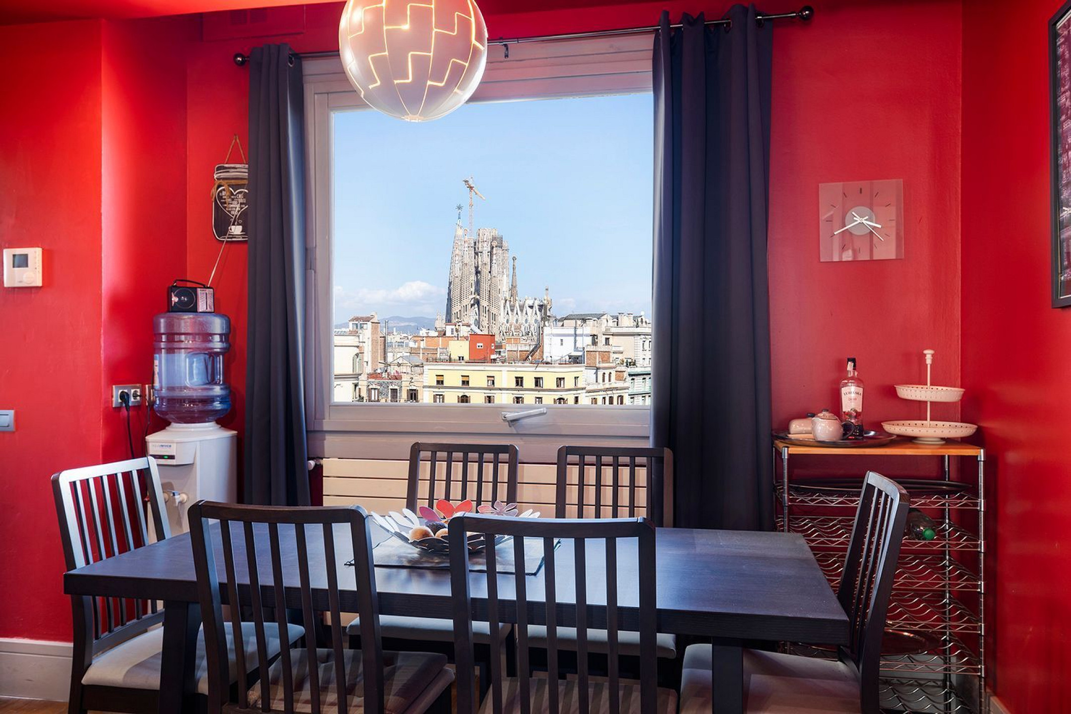 The fully equipped kitchen, finished in a striking red lacquer, is directly connected to the dining area and opens through a large window framing one of Barcelona’s most iconic landmarks: the Sagrada Família, integrated here as a defining architectural feature of the space.