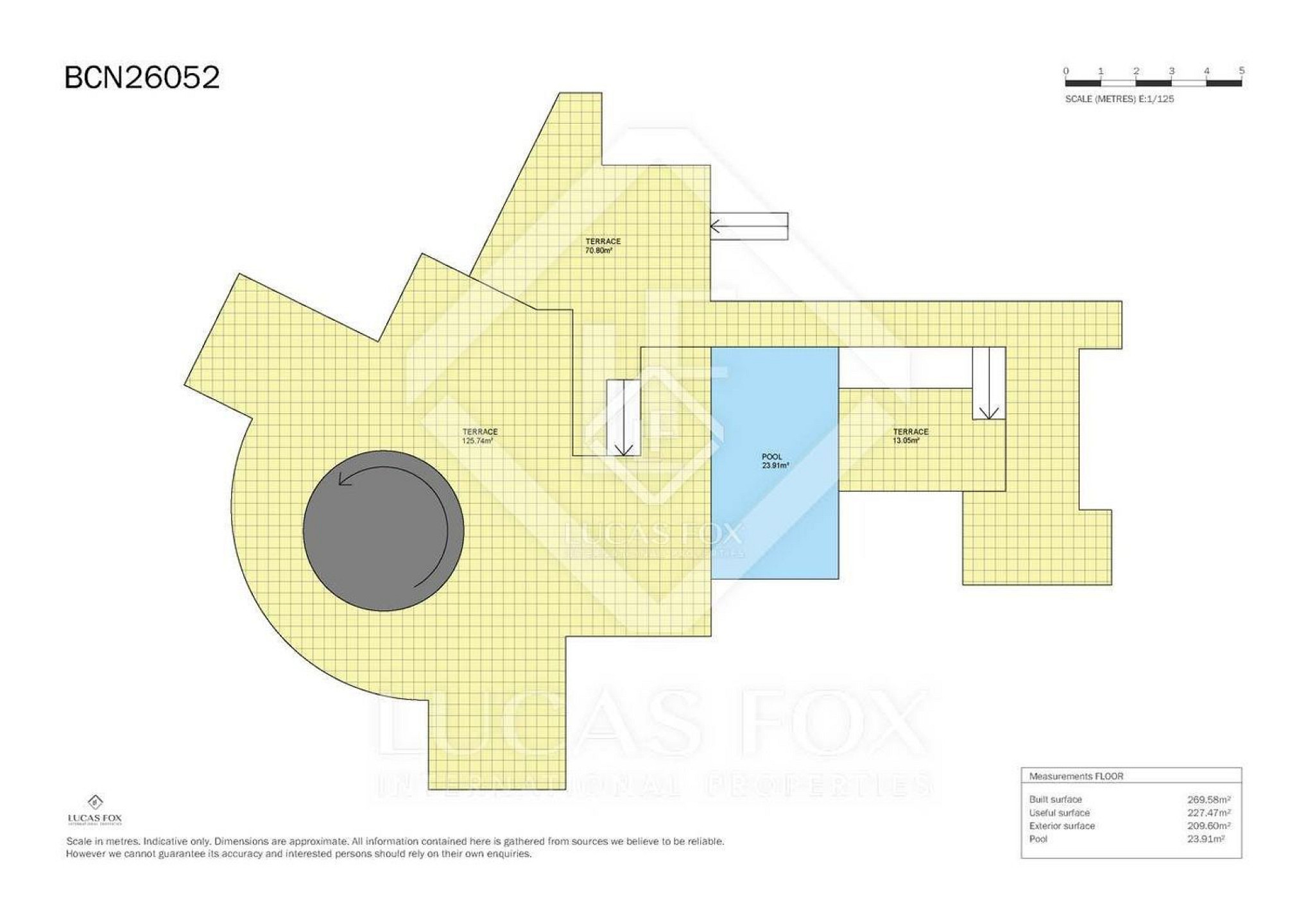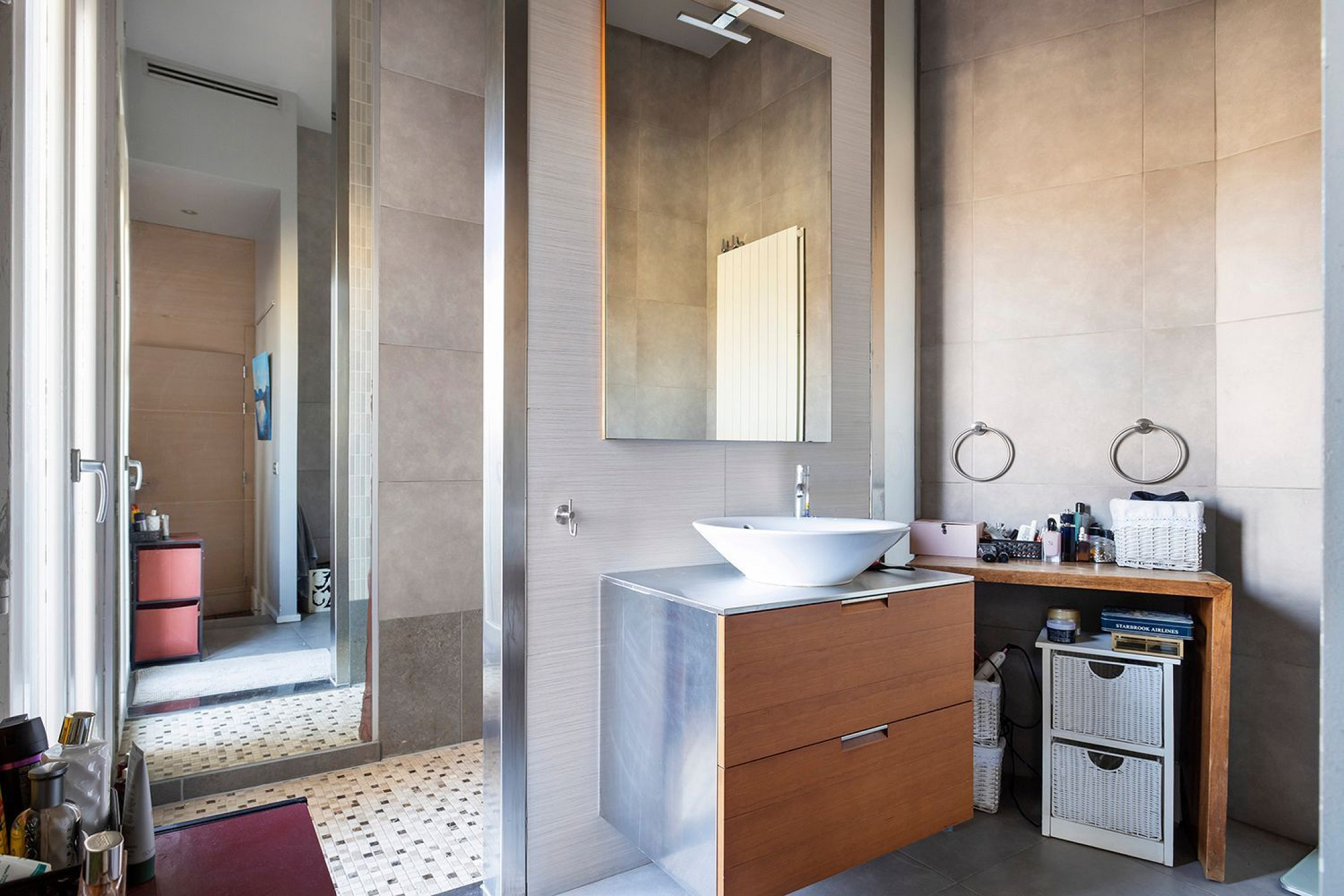 The upper floor hosts a versatile living area with access to approximately 200 m² of terraces, where various chill-out zones, a swimming pool and a jacuzzi create a private oasis above the city. From this level, an internal spiral staircase leads to the upper tower, a privileged vantage point offering 360º panoramic views across Barcelona.